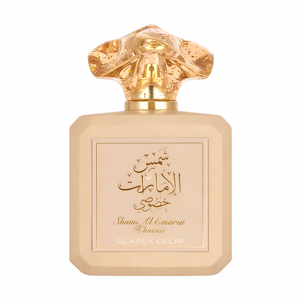 Shams Al Emarat Khususi Glaze & Glow de Ard Al Zaafaran es un Eau de Parfum de 100ml conocido por su perfil dulce, cremoso y afrutado, ideal para los amantes de los aromas tipo almizcle de vainilla. Presenta notas de salida de canela y manzana, un corazón de pera y vainilla, y una base de caramelo, cedro y haba tonka.